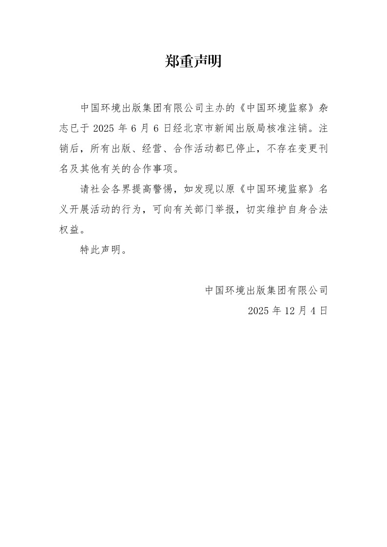 中國(guó)環(huán)境出版集團(tuán)有限公司主辦的《中國(guó)環(huán)境監(jiān)察》雜志已于2025年6月6日經(jīng)北京市新聞出版局核準(zhǔn)注銷。